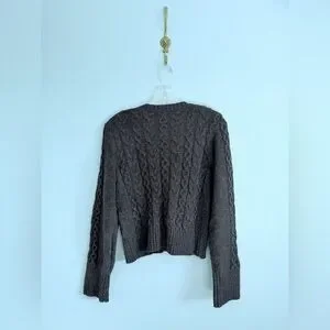 Charcoal cable knit cardigan with button front. Classic round neckline and fitted silhouette. Tortoiseshell-style buttons add warm contrast. Cozy textured knit for layered looks. Semi-cropped bodice with full-length sleeves.