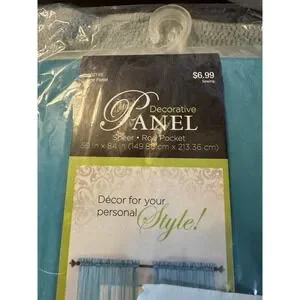 The product is a set of two turquoise teal sky blue sheer curtain panels from Hobby Lobby, measuring 59 inches wide and 84 inches long. These curtain panels are perfect for adding a pop of color to any room and are designed to fit standard size rods. The sheer material allows for privacy while still letting in natural light, creating a bright and airy atmosphere in your home.