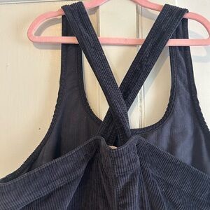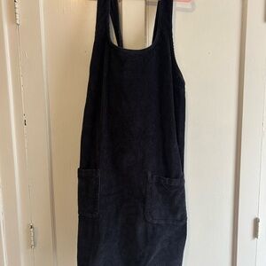 Stylish black corduroy pinafore dress with front pockets. Perfect for layering. Great winter piece! Straps can be crossed or attached across.