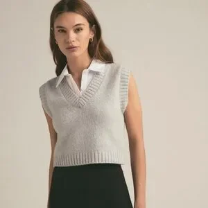 Cut from a soft wool-cashmere blend, The Leigh Vest has a crisp poplin collar underneath. It's cut for a slim fit with a V-neckline and ribbed pattern for a classic look.