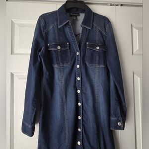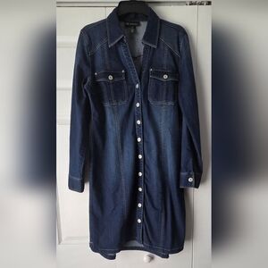 Button-front stretch denim dress by INC International Concepts. Long sleeves with button cuffs.