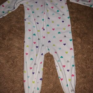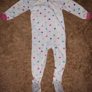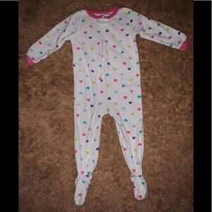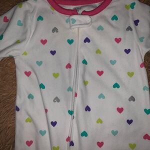 Zips from ankle to chin. Snap button at front top. Footed with elasticized backs and grippers. Ribbed cuffs & neckline. Multicolor heart design. Flame resistant. Body: 100% polyester. Sole: 65% polyester/35% cotton. Size: 3T. Preowned in good condition