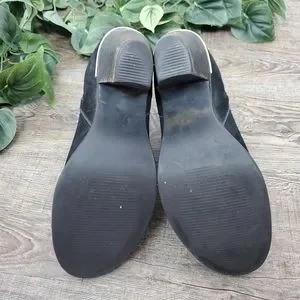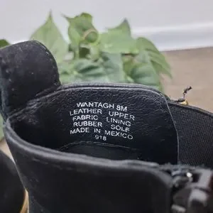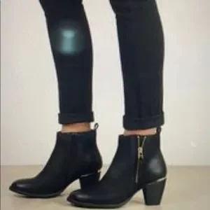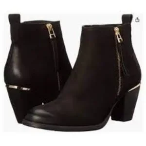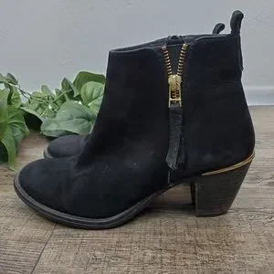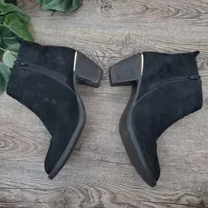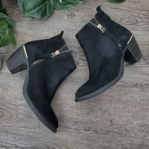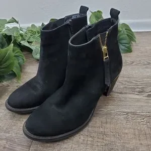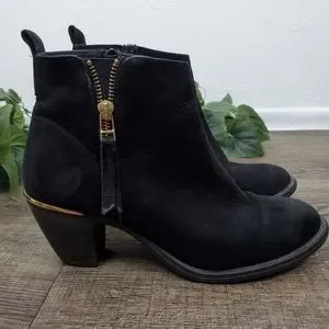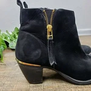Features and description: Wantagh ankle boots; stacked block heel; gold zipper and heel detail; nubuck suede leather; black; factory distressed