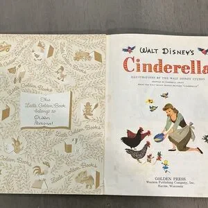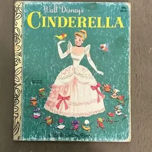 Classic Walt Disney Cinderella Little Golden Book with a pink dress illustration. Charming teal cover and playful multicolor accents. Perfect for kids who love Disney stories and collectible storybooks.