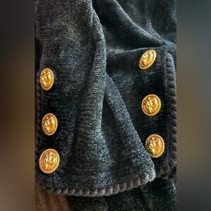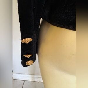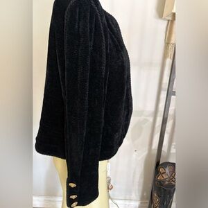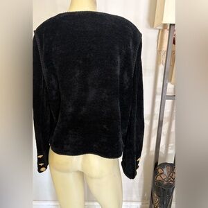 Luxurious black teddy blazer jacket by St.John sport size 10 with Soft texture and elegant design. Ideal for versatile styling.There are no tears or stains.there is braiding around the front and on the sleeve with big gold buttons on the sleeves.