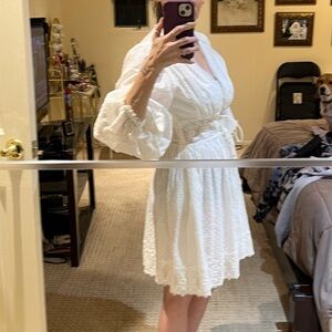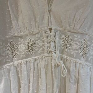 Zimmermann Ivory Floral Lace Dotted Mini Dress. V- Neckline with a button closure. Embroidered dots. Hidden side zipper. Adjustable lace up straps at waistline. Short sleeves with elastic cuffs. Lined skirt. Excellent Condition. 100% Cotton. This is a Zimmermann size 1=US Small.