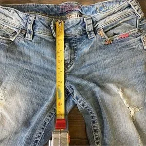 Trendy light blue flare jeans. Distressed embroidered details for a modern look. Perfect for casual wear. Silver Tuesdays. Altered hemm. Measurements in pictures