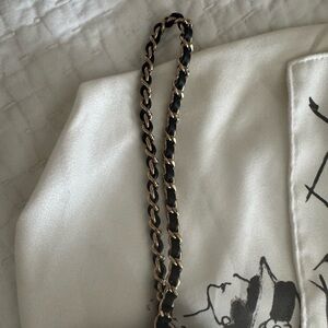 Stylish two-tone clutch with iconic logo. Features chain strap. Sophisticated design. Dust bag and Box