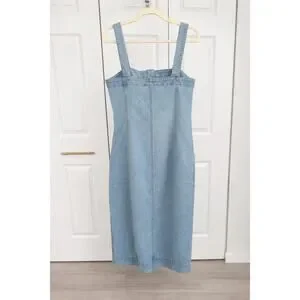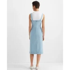A modern denim midi dress featuring a flattering fitted silhouette, wide straps, and full button-front closure. The structured panel construction creates a streamlined shape while still being comfortable thanks to a hint of stretch. Perfect for spring and summer styling with sandals, flats, or sneakers.