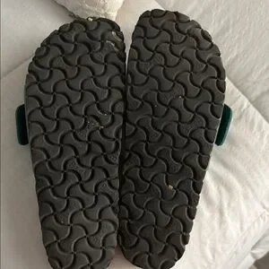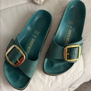 Chic Birkenstock slides in turquoise. Features a striking gold buckle. Ideal for everyday comfort.