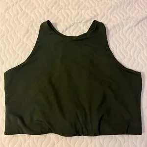 High-neck crop top in deep olive green. Smooth knit fabric with a fitted silhouette. Sleeveless design ideal for layering or workouts. Minimal, modern look for easy pairing.