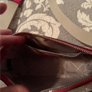 Stylish Michael Kors crossbody with cream base and vibrant hot pink floral pattern. Features paired coin pouch and adjustable strap for versatile wear. Eye-catching design adds a pop of color to any outfit. Missing iPod case.