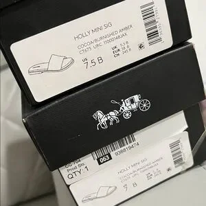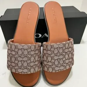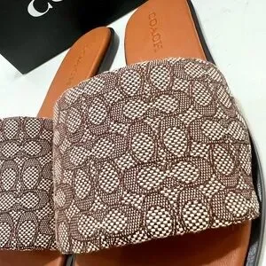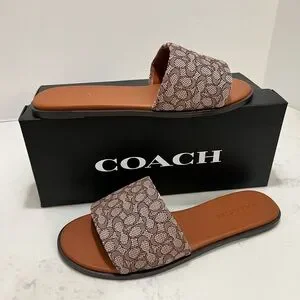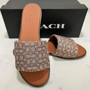 Coach slide sandals with signature monogram fabric strap. Smooth tan leather footbed for everyday wear. Easy slip-on design with low-profile sole. Casual and versatile style.