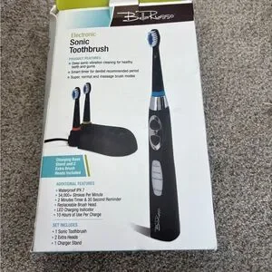 NIB Bella Russo Electric Sonic Toothbrush Charging Base 2 Extra Heads Deep Clean. Box is a little banged up but all parts are in excellent, unused condition