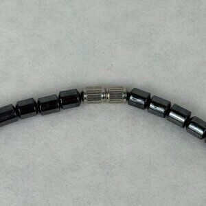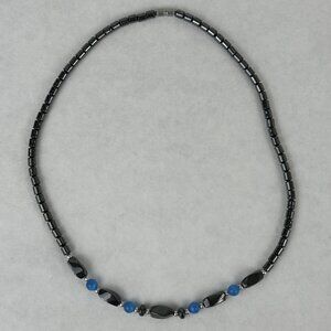 Hematite and Blue Beaded Necklace With Barrel Clasp Unisex 18 Inches Long