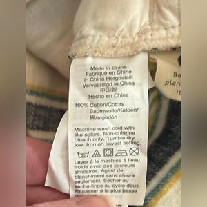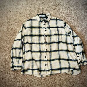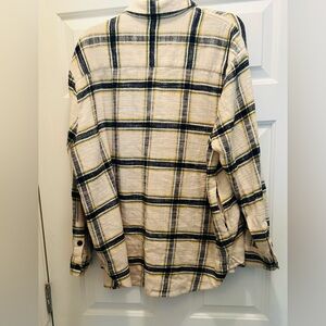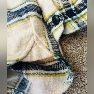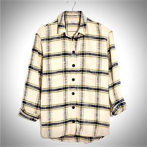 NWOT Madewell Ex-Boyfriend relaxed plaid button-down shacket with a cream base. Navy and yellow/gold stripe detailing across the fabric. Button-front style with rolled sleeves. Easy to layer over tees or under jackets.