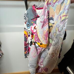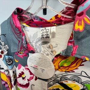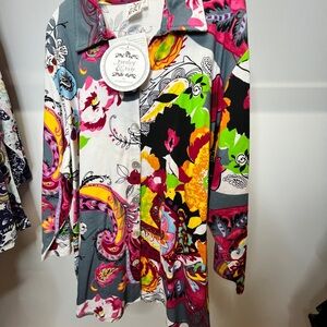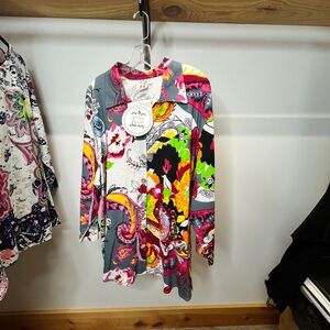 Button-front shirt with bold paisley and floral motifs. Bright pops of pink, yellow, green and black. Soft gray base with white accents. Eye-catching and playful print.