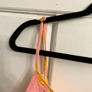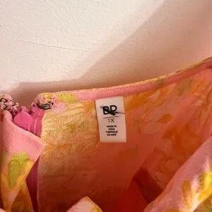 Lovely pink dress with vibrant yellow floral design. Features a tie-front and spaghetti straps.