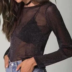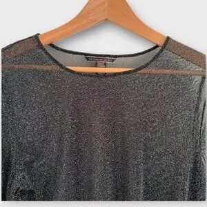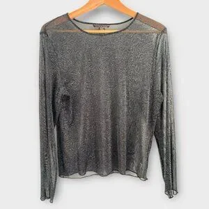 Sheer shimmer mesh top from Victoria’s Secret in a black and silver metallic knit. Lightweight and see-through with a soft stretch fit. Features a classic crew neck and long sleeves. Chic and sparkly piece for layering over a bralette, bodysuit or cami.