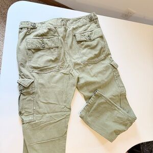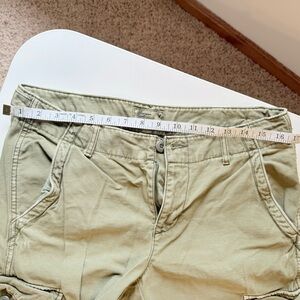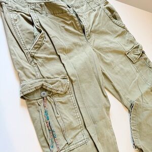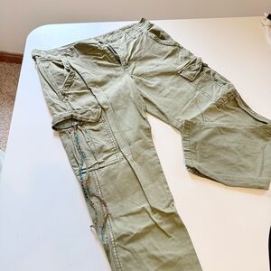 Classic early 2010s utility style! These American Eagle cargo pants feature a lived-in olive green wash and the iconic colorful patterned drawstring detail on the side pocket.