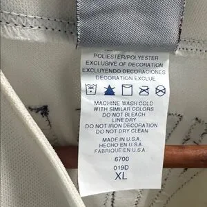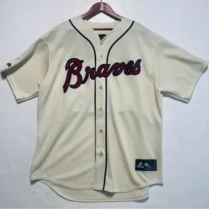 Majestic-branded Jason Heyward Braves jersey in cream with bold red script and black trim. Breathable fabric for comfortable all-day wear. Classic button-front design ideal for fans and casual styling. Features team script embroidery for authentic look. Official merchandise. Slight spotting around the bottom hem of shirt. I did not attempt to remove. Looks like dust.