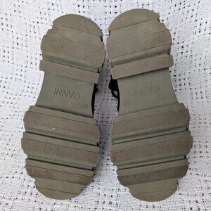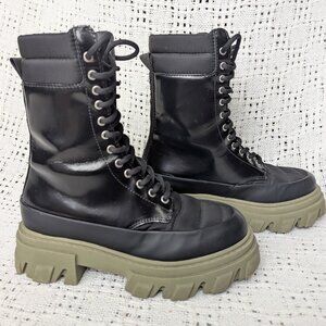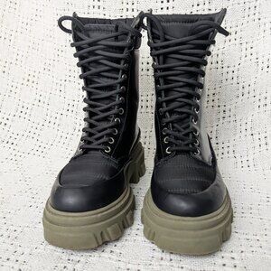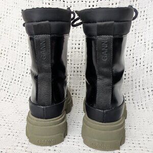 GANNI lace-up combat boots featuring a black leather and tech upper paired with a contrasting army green chunky rubber lug sole. US Retail price: $475 Size 35, US 5 Outsole: 10.25", Width 4.25" Heel 2" Platform 1.375" Tall 7.5" (without heel) Insole 9" Very good condition, lightly used Please review pictures carefully as they are part of description.