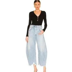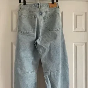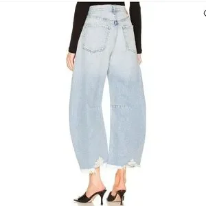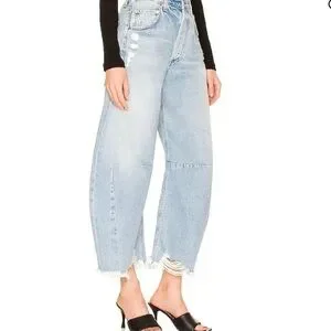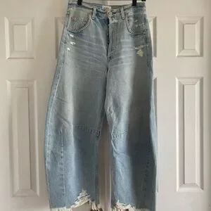 EUC Citizens of Humanity Horseshoe jeans Sz. 27 boast a curved, wide-leg silhouette with whiskering and fading detail with intentionally distressed areas throughout. 100% cotton, button fly, in light blue Savahn wash. Smoke/per feee home.