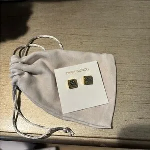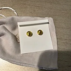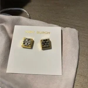 Tory Burch stud earrings with signature logo detail. Gold-tone metal with white enamel inlay. Classic and versatile style. Easy to wear for everyday or dressy looks.