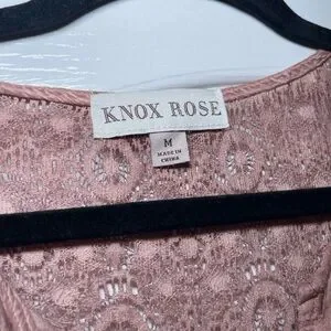 Knox Rose long sleeve top in a dusty rose tone. Features a lace yoke and pleated front for a feminine look. Lightweight, soft fabric for everyday comfort. Includes subtle trim detail at the hem.