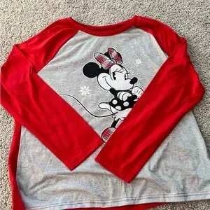 This is a set of Minnie Mouse PJ’s. This set has a long sleeve top with Minnie Mouse on them. The pants are long and they are plaid. The plaid matches the bow on Minnie ear. They have an elastic waist