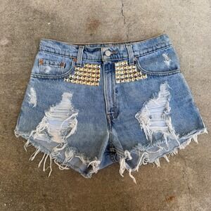 Vintage Levi's 550 high-waisted denim shorts feature a custom-distressed look with heavy fraying and silver-tone pyramid stud embellishments on the front pockets. Crafted from 100% cotton in a light wash, these shorts offer a relaxed fit with a classic five-pocket design and the iconic red tab on the back. The raw, frayed hem and destroyed detailing provide a rugged, punk-inspired aesthetic perfect for summer festivals or casual wear.