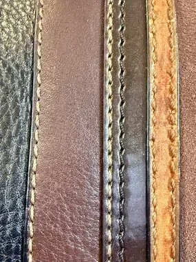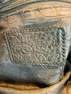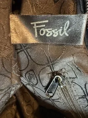 Older Fossil leather bag. The lining is in great condition. There are three center compartments, two magnet snap and one zipper. The zipper has a second inner zipper coin pouch. There are two call outs. One is that it probably had a key and possibly another strap, which are gone (I should have heeded the not for under 12 warning on the tag because that is probably why the key is gone, lol). Two, it had faux reptile texture on the lightest of the stripes. It started peeling and I took it all off because I thought it looked better. (Shown in photos). I still think it looks better.