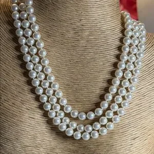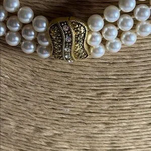 This stunning 3 strand pearl necklace features a luxurious gold accent. Golden with wavy diamond like stones and bronze with crystals that is really the magnetic clasp for the necklace. 17 inches long fills in your neckline beautifully. Perfect for adding elegance to any outfit. Ideal for special occasions or everyday wear. Who says you can’t wear pearls and denim? Beautiful necklace 🌟 Thanks for stopping by 💜🌴