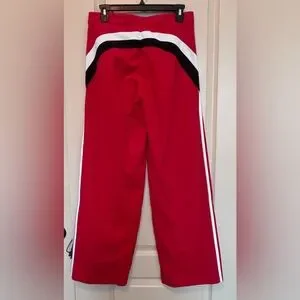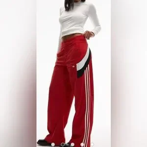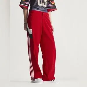 • Do not bleach, dry clean, tumble dry, or use fabric softener Relaxed-fit adidas track pants in bold red. Signature three white stripes run down each leg. Sporty colorblock pocket detail adds contrast. Soft athletic fabric for everyday wear.