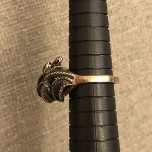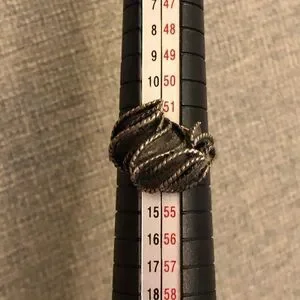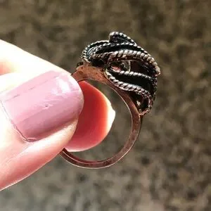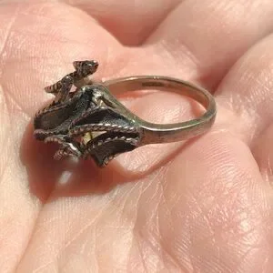 Vintage stamped sterling silver freeform oxidized leaf ribbon ring size 6.25. Striking ring with a slightly high profile look. Sense of motion thanks to the curved lines of each “leaf” segment. Marked Sterling on inside band. Sits at size 6.25 on my ring sizer.