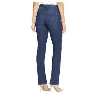 Gloria Vanderbilt Rail Straight jeans in the Vail wash, a mid-rise, straight-leg jean with a stretch denim fabric. These jeans feature a classic five-pocket style, a zipper fly, and belt loops, and are known for their comfort due to their soft, stretchy material. The Vail wash is a medium blue, and the overall style is considered a timeless, versatile classic.