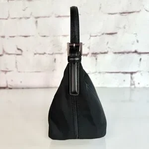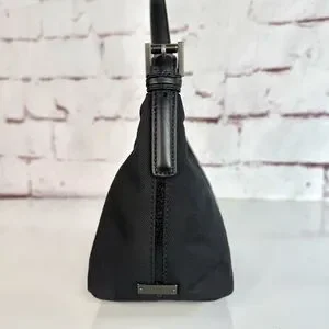 SO cute, sleek, stylish and classic ! Y2K-era Coach mini bag features leather trim and silver hardware. Leather strap with pewter hardware is adjustable at both ends. Crafted from durable black nylon, this compact bag is perfect for carrying your essentials — fits most phones, mini wallet, lip gloss, eyeshadow, mascara, tissues, etc.