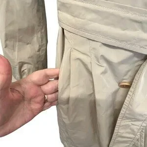 Beautifully tailored Banana Republic trench coat in a versatile sandy beige. This lightweight coat features a flattering fit-and-flare silhouette with a matching tie-waist belt and a classic button-front closure. Perfect for transitional weather or as a polished rain coat.