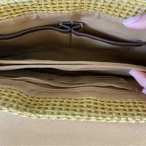 •Lots of inner pockets: The main compartment is divided into two with a zippered pocket between them. There are two open pockets on one side trimmed with the same faux leather material used on the handles and bottom of the bag. The other side has a zippered pocket and credit card slots.