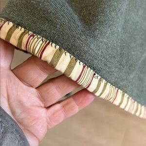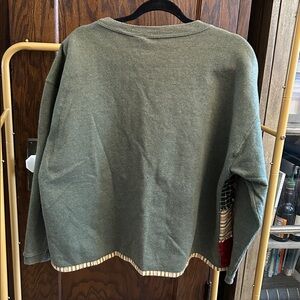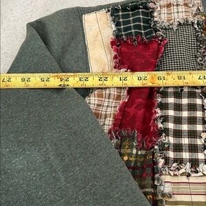 Patchwork quilted cardigan with mixed fabric squares. Button-front closure. Olive green knit sleeves and trim. Cozy layered texture and warm fall tones.