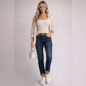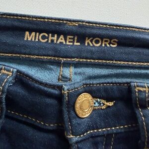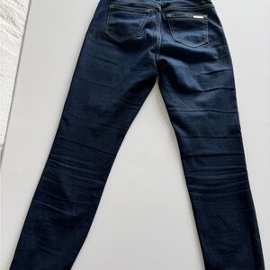 Classic Michael Kors dark wash denim with a flattering skinny/straight leg silhouette. These jeans have a clean, polished look that dresses up easily while still being comfortable thanks to a touch of stretch. Finished with gold-tone hardware and subtle MK branding on the back pocket.