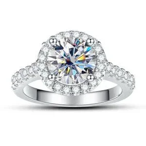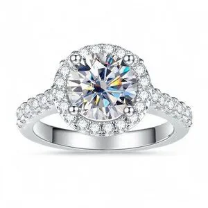 This ring features a 1-carat round brilliant-cut diamond simulant center stone, surrounded by a halo of moissanite stones with moissanite accents along the band. It is crafted in S925 sterling silver (unmarked).