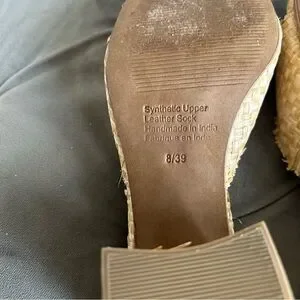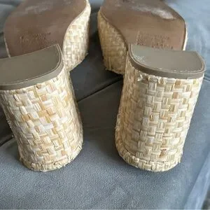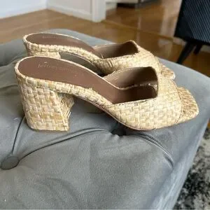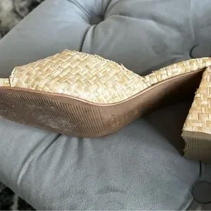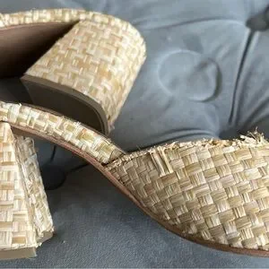 Slip-on woven mules with a chunky block heel. Open toe and woven straw-like upper. good used condition size 8.
