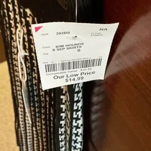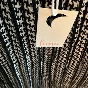 Stylish black and white pleated midi skirt with a classic houndstooth-inspired pattern. Stretch knit waistband provides a comfortable, flattering fit. Lightweight pleats offer graceful movement for day-to-night wear. Versatile piece that pairs well with blouses or fitted knits for a polished look.