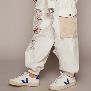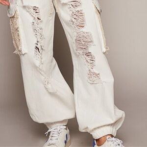 Made with large cargo pockets that bring the utilitarian 90s aesthetic, while the wide leg and distressed holes at a hobo lived in vagabond vibe.