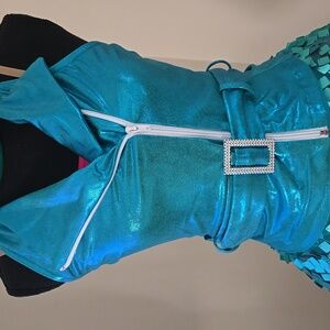 *Shiny metallic turquoise sleeveless halter asymmetrical zipper vest with silver tone plastic belt.