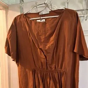 Relaxed brown maxi dress by Zara. Short sleeves and a V-neck. Drawstring waist with decorative bead tassels. Lightweight, flowy silhouette. Easy, casual style.NWT