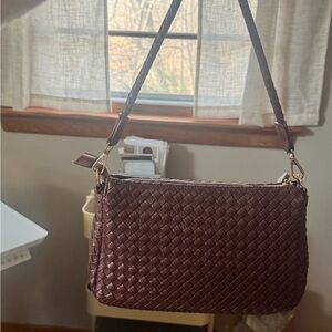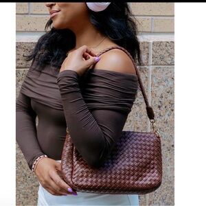 This stylish Modern + Chic Woven texture cinnamon crossbody bag is perfect for any occasion. sleek design and versatile color. Includes two straps a shoulder strap or adjustable crossbody strap .