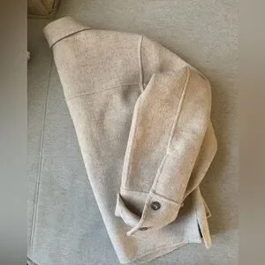 Wool-blend pea coat with a simple collar and button-front closure. Two large patch pockets at the front. Clean lines and a neutral light beige tone. Easy to pair with casual or refined outfits.