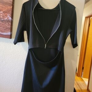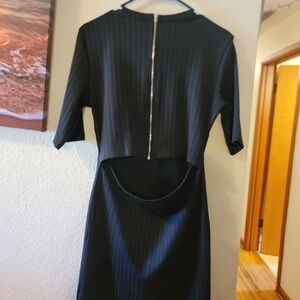 Chic black dress with mid sleeves. Dress reveals lower back. Perfect for versatile styling.